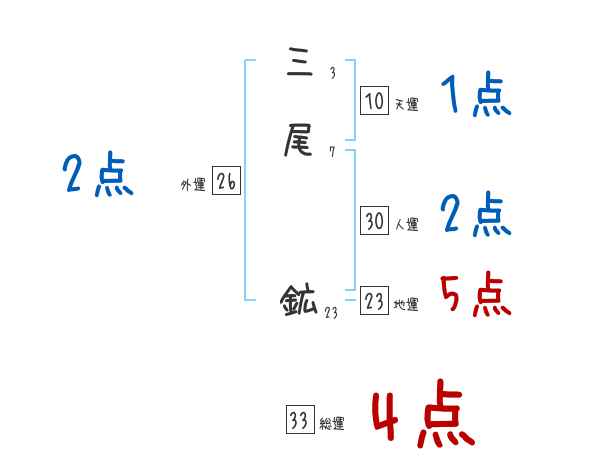 天運![]() | 三尾鉱さんの天運は10画の1つ星!不安を感じやすい傾向。ストレスを抱えないように注意しましょう。 家系が持つ宿命的な運勢を表します。祖先から受け継いだ苗字ですので自分の力が及びません。家柄を象徴します。 |