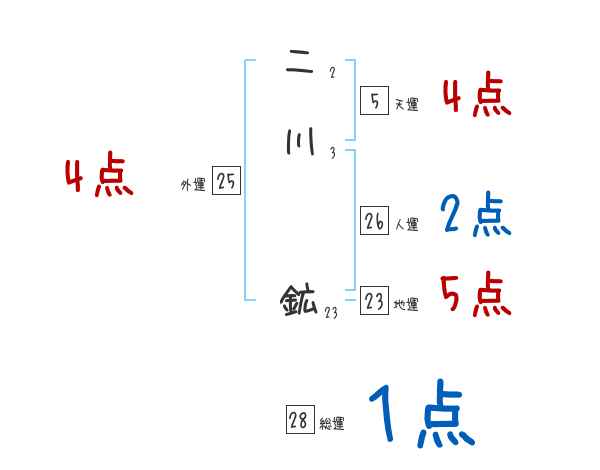 総運![]() | 二川鉱さんの総運は28画の1つ星!家庭環境に注意。スポーツで活躍できる能力があるかも。 あなたの人生を表す1番重要な運勢です。生涯を通じて影響する総合運となり、主に50歳以降の晩年期に影響を及ぼします。 |