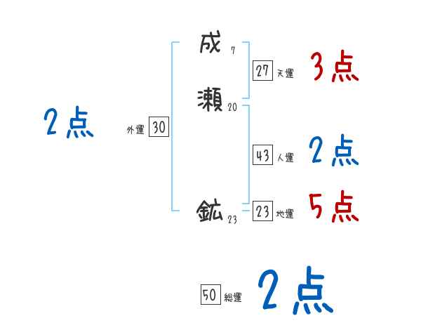 総運![]() | 成瀬鉱さんの総運は50画の2つ星!浮き沈みが激しく不安定。しりすぼみに衰退しやすいので注意しましょう。 あなたの人生を表す1番重要な運勢です。生涯を通じて影響する総合運となり、主に50歳以降の晩年期に影響を及ぼします。 |