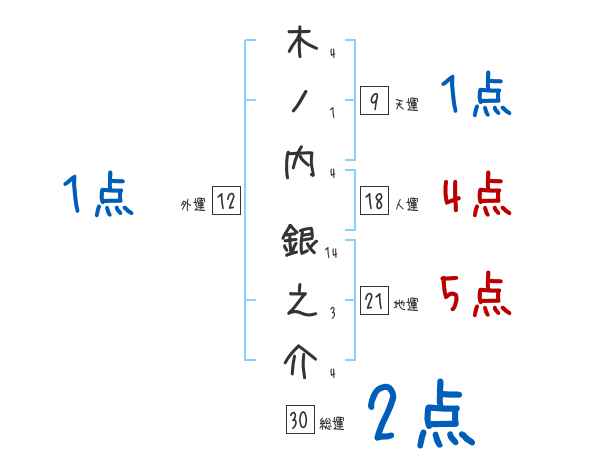 天運![]() | 木ノ内銀之介さんの天運は9画の1つ星!消極的で才能を発揮することが苦手なことも。周りの意見に耳を傾けましょう。 家系が持つ宿命的な運勢を表します。祖先から受け継いだ苗字ですので自分の力が及びません。家柄を象徴します。 |
