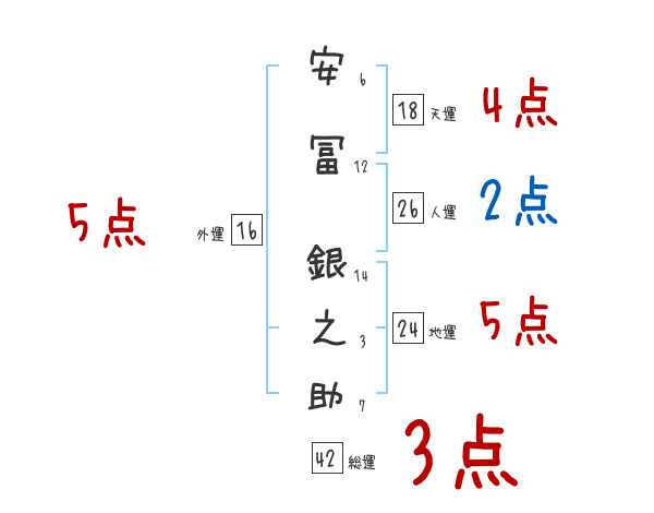 外運![]() | 安冨銀之助さんの外運は16画の5つ星!人望が厚く大きく発展する。逆転成功が見える。 生活面を象徴する運勢です。外部から受ける影響力を表し、結婚運、家庭運や職場、環境への順応性を表します。 |