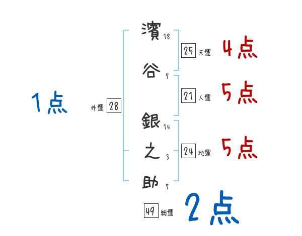 | 総運  | 濱谷銀之助さんの総運は49画の2つ星!不安定な性格で明暗がある人生。周りの人には支援されやすい。あなたの人生を表す1番重要な運勢です。生涯を通じて影響する総合運となり、主に50歳以降の晩年期に影響を及ぼします。 |