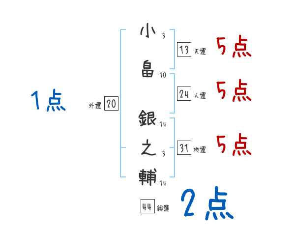 人運![]() | 小畠銀之輔さんの人運は24画の5つ星!家庭運が良く順調な人生。金運にも恵まれる。 性格や才能などを表す2番目に重要な運勢です。人間関係や協調性、社会的な成功に影響します。主に20歳から50歳ぐらいまでの中年期の運勢を表します。 |