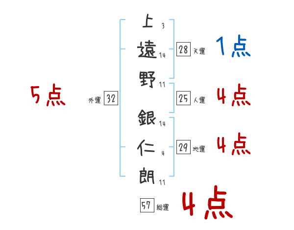 外運![]() | 上遠野銀仁朗さんの外運は32画の5つ星!柔軟性があり成功する。チャンスが多く金運が良い。 生活面を象徴する運勢です。外部から受ける影響力を表し、結婚運、家庭運や職場、環境への順応性を表します。 |