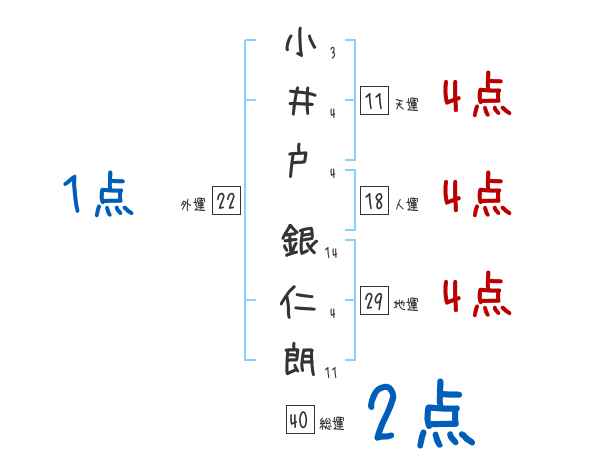 外運![]() | 小井戸銀仁朗さんの外運は22画の1つ星!努力することが苦手ないっぽう手先が器用。芸術性にも優れる。 生活面を象徴する運勢です。外部から受ける影響力を表し、結婚運、家庭運や職場、環境への順応性を表します。 |