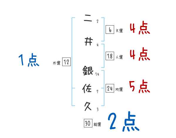 天運![]() | 二井銀佐久さんの天運は6画の4つ星!慎重な努力家で信頼を得る。誠実な精神で向上心に優れる。 家系が持つ宿命的な運勢を表します。祖先から受け継いだ苗字ですので自分の力が及びません。家柄を象徴します。 |
