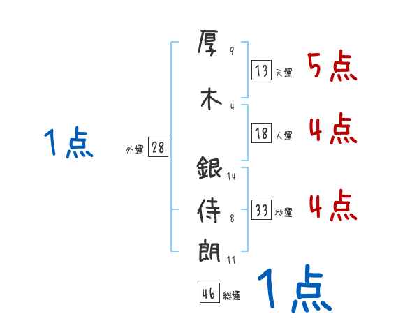 天運![]() | 厚木銀侍朗さんの天運は13画の5つ星!才能に恵まれ人気がある。名声を手に入れる。円満な人生。 家系が持つ宿命的な運勢を表します。祖先から受け継いだ苗字ですので自分の力が及びません。家柄を象徴します。 |