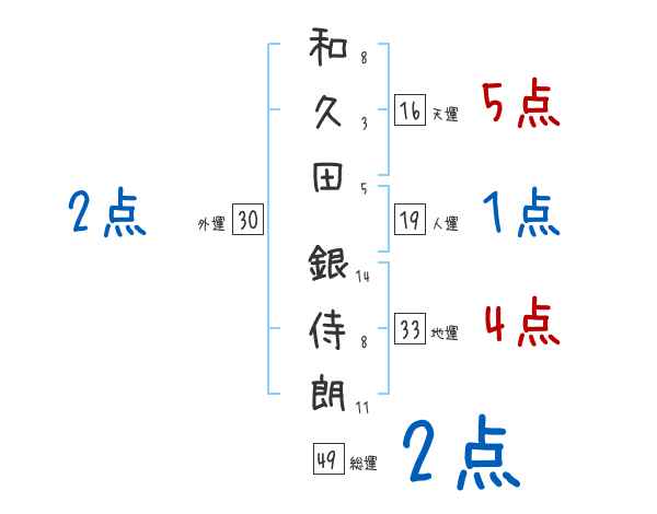 天運![]() | 和久田銀侍朗さんの天運は16画の5つ星!人望が厚く大きく発展する。逆転成功が見える。 家系が持つ宿命的な運勢を表します。祖先から受け継いだ苗字ですので自分の力が及びません。家柄を象徴します。 |
