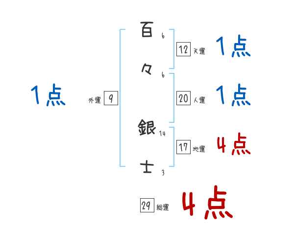 外運![]() | 百々銀士さんの外運は9画の1つ星!消極的で才能を発揮することが苦手なことも。周りの意見に耳を傾けましょう。 生活面を象徴する運勢です。外部から受ける影響力を表し、結婚運、家庭運や職場、環境への順応性を表します。 |