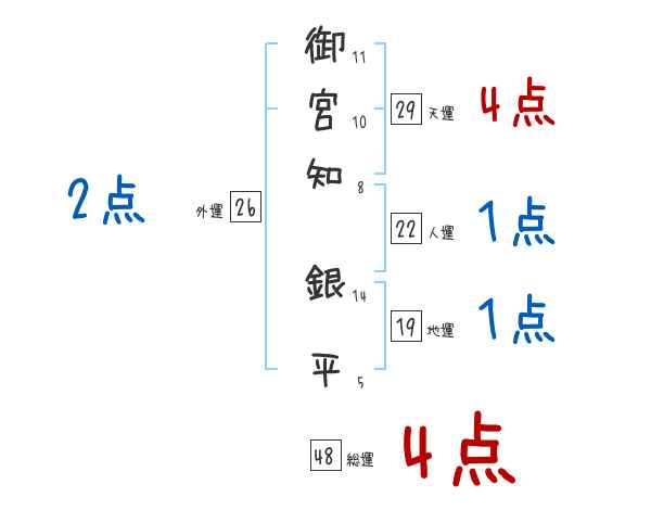 外運![]() | 御宮知銀平さんの外運は26画の2つ星!波瀾万丈かも。信頼できる人を大事にしましょう。 生活面を象徴する運勢です。外部から受ける影響力を表し、結婚運、家庭運や職場、環境への順応性を表します。 |