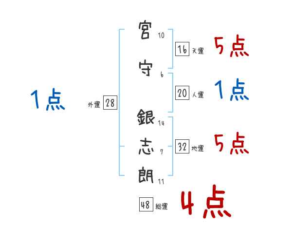 天運![]() | 宮守銀志朗さんの天運は16画の5つ星!人望が厚く大きく発展する。逆転成功が見える。 家系が持つ宿命的な運勢を表します。祖先から受け継いだ苗字ですので自分の力が及びません。家柄を象徴します。 |