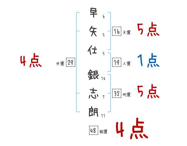 総運![]() | 早矢仕銀志朗さんの総運は48画の4つ星!賢明な性格で人望が厚い。指導力があり多くの人に尊敬される。 あなたの人生を表す1番重要な運勢です。生涯を通じて影響する総合運となり、主に50歳以降の晩年期に影響を及ぼします。 |
