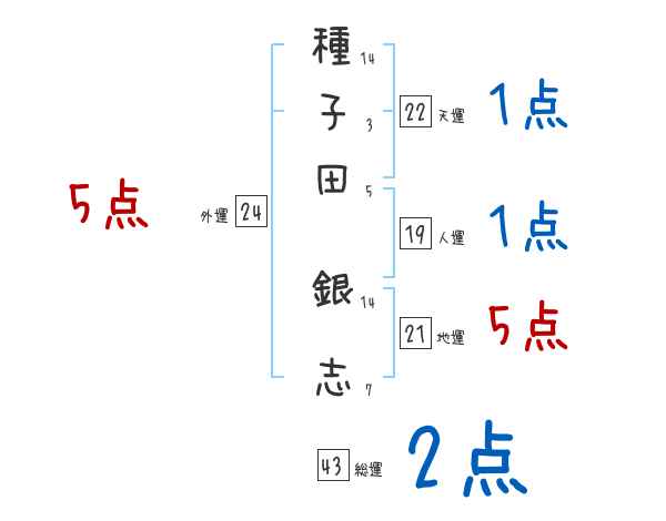 外運![]() | 種子田銀志さんの外運は24画の5つ星!家庭運が良く順調な人生。金運にも恵まれる。 生活面を象徴する運勢です。外部から受ける影響力を表し、結婚運、家庭運や職場、環境への順応性を表します。 |