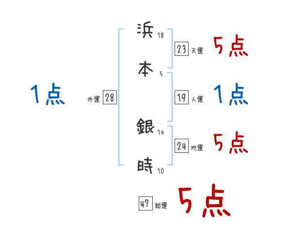 人運![]() | 浜本銀時さんの人運は19画の1つ星!優れた才能を持ちますが、協調性が足りないことも。周りの人と協力する事を意識しましょう。 性格や才能などを表す2番目に重要な運勢です。人間関係や協調性、社会的な成功に影響します。主に20歳から50歳ぐらいまでの中年期の運勢を表します。 |