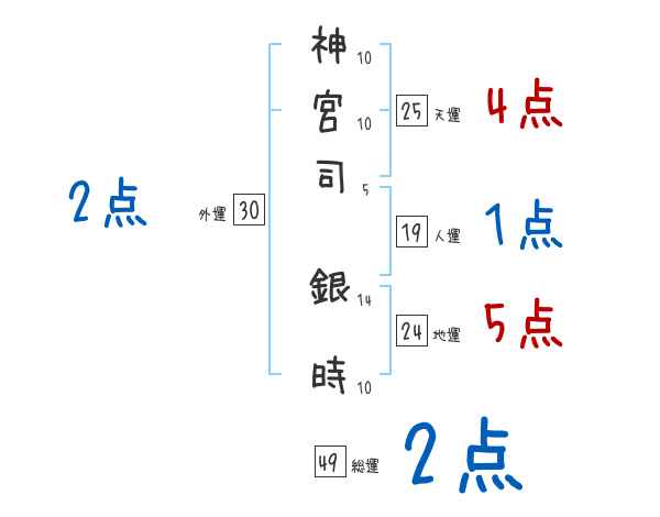 外運![]() | 神宮司銀時さんの外運は30画の2つ星!浮き沈みの激しさに注意しましょう。 生活面を象徴する運勢です。外部から受ける影響力を表し、結婚運、家庭運や職場、環境への順応性を表します。 |