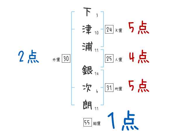 総運![]() | 下津浦銀次朗さんの総運は55画の1つ星!欲張りな性格で軽率な行動に注意しましょう。病気に気をつけて。 あなたの人生を表す1番重要な運勢です。生涯を通じて影響する総合運となり、主に50歳以降の晩年期に影響を及ぼします。 |