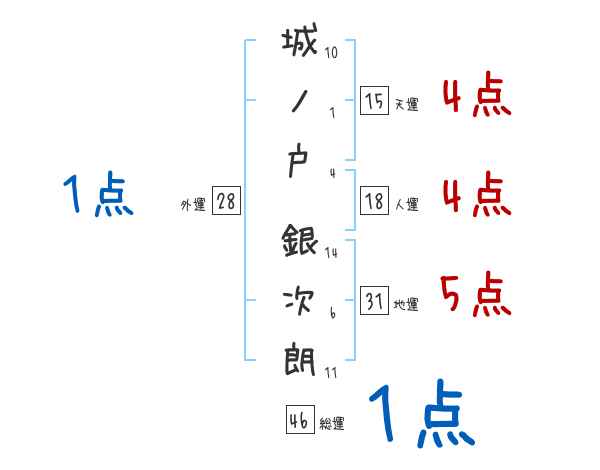 天運![]() | 城ノ戸銀次朗さんの天運は15画の4つ星!人徳があり出世する。順調に物事を進め円満な人生。 家系が持つ宿命的な運勢を表します。祖先から受け継いだ苗字ですので自分の力が及びません。家柄を象徴します。 |