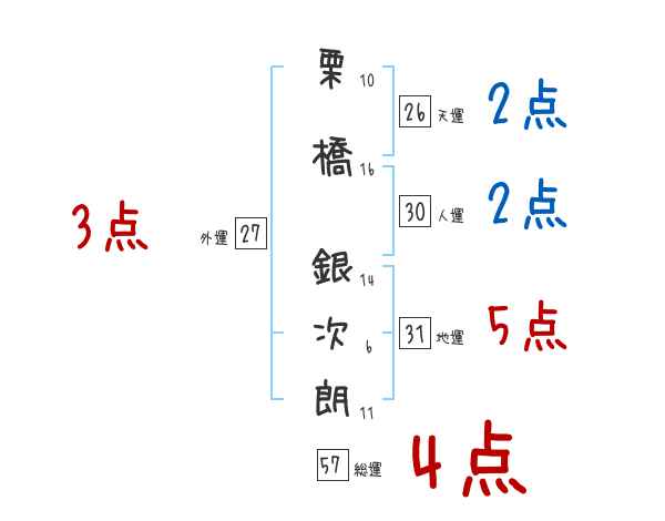 総運![]() | 栗橋銀次朗さんの総運は57画の4つ星!向上心があり人望がある。地位を得る。 あなたの人生を表す1番重要な運勢です。生涯を通じて影響する総合運となり、主に50歳以降の晩年期に影響を及ぼします。 |