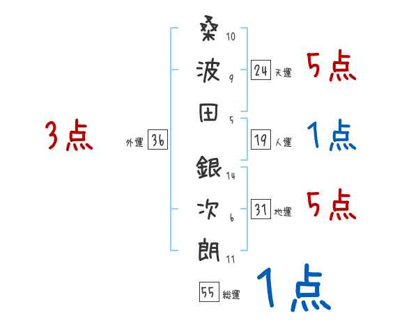 天運![]() | 桑波田銀次朗さんの天運は24画の5つ星!家庭運が良く順調な人生。金運にも恵まれる。 家系が持つ宿命的な運勢を表します。祖先から受け継いだ苗字ですので自分の力が及びません。家柄を象徴します。 |