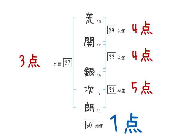 天運![]() | 荒関銀次朗さんの天運は29画の4つ星!完全主義で才能がある。厳格な心の持ち主。 家系が持つ宿命的な運勢を表します。祖先から受け継いだ苗字ですので自分の力が及びません。家柄を象徴します。 |