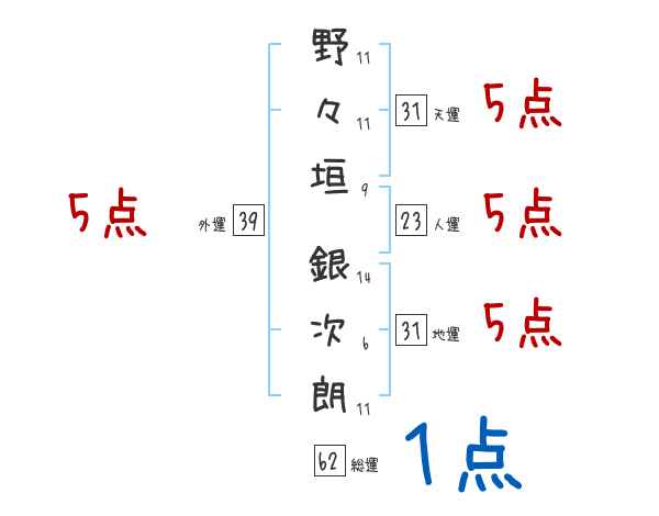 天運![]() | 野々垣銀次朗さんの天運は31画の5つ星!社交性があり判断力に優れる。順風満帆な人生で円満な生活。 家系が持つ宿命的な運勢を表します。祖先から受け継いだ苗字ですので自分の力が及びません。家柄を象徴します。 |