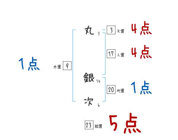 天運![]() | 丸銀次さんの天運は3画の4つ星!活動的で才能に恵まれ、多くの信頼を得る。希望に満ち成長する。 家系が持つ宿命的な運勢を表します。祖先から受け継いだ苗字ですので自分の力が及びません。家柄を象徴します。 |