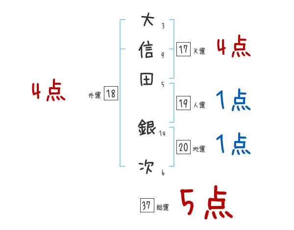 総運![]() | 大信田銀次さんの総運は37画の5つ星!努力家で順応性に優れる。現実的な考え方ができ忠実に物事をこなす。 あなたの人生を表す1番重要な運勢です。生涯を通じて影響する総合運となり、主に50歳以降の晩年期に影響を及ぼします。 |