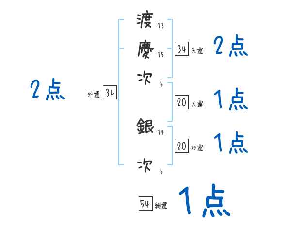 天運![]() | 渡慶次銀次さんの天運は34画の2つ星!独創性に優れるが、自尊心が強く災難に注意しましょう。 家系が持つ宿命的な運勢を表します。祖先から受け継いだ苗字ですので自分の力が及びません。家柄を象徴します。 |