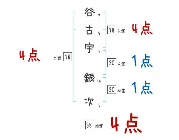 外運![]() | 谷古宇銀次さんの外運は18画の4つ星!情熱的で剛気。忍耐力があり信頼される。 生活面を象徴する運勢です。外部から受ける影響力を表し、結婚運、家庭運や職場、環境への順応性を表します。 |