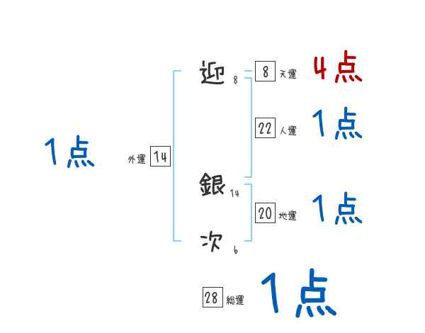 天運![]() | 迎銀次さんの天運は8画の4つ星!勤勉家。根気強く努力し成功する。忍耐力がある。 家系が持つ宿命的な運勢を表します。祖先から受け継いだ苗字ですので自分の力が及びません。家柄を象徴します。 |