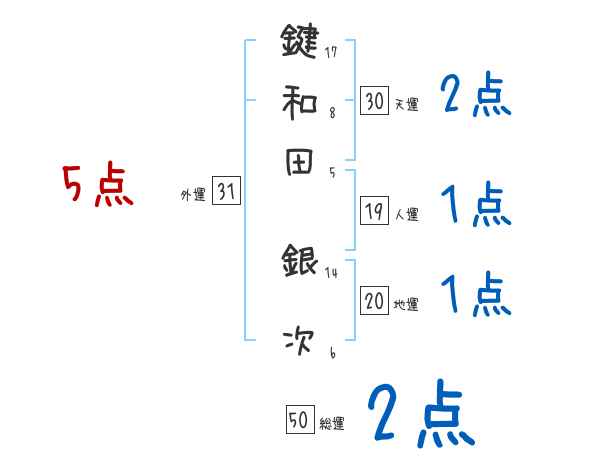 天運![]() | 鍵和田銀次さんの天運は30画の2つ星!浮き沈みの激しさに注意しましょう。 家系が持つ宿命的な運勢を表します。祖先から受け継いだ苗字ですので自分の力が及びません。家柄を象徴します。 |