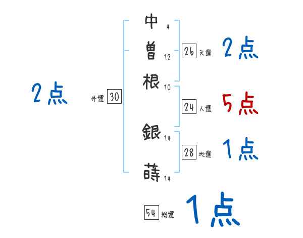 人運![]() | 中曽根銀蒔さんの人運は24画の5つ星!家庭運が良く順調な人生。金運にも恵まれる。 性格や才能などを表す2番目に重要な運勢です。人間関係や協調性、社会的な成功に影響します。主に20歳から50歳ぐらいまでの中年期の運勢を表します。 |