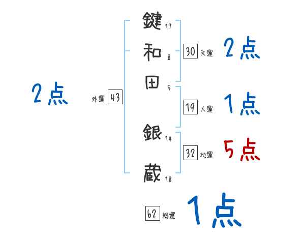 地運![]() | 鍵和田銀蔵さんの地運は32画の5つ星!柔軟性があり成功する。チャンスが多く金運が良い。 個性を表す基礎的な運勢です。性格形成や対人関係、行動力など家庭環境に影響されます。主に誕生してから20歳くらいまでの若年期の運勢を表します。 |