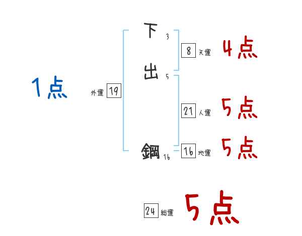 天運![]() | 下出鋼さんの天運は8画の4つ星!勤勉家。根気強く努力し成功する。忍耐力がある。 家系が持つ宿命的な運勢を表します。祖先から受け継いだ苗字ですので自分の力が及びません。家柄を象徴します。 |