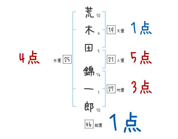 人運![]() | 荒木田錦一郎さんの人運は21画の5つ星!統率力がある。独立し成功する。名誉を手に入れる。 性格や才能などを表す2番目に重要な運勢です。人間関係や協調性、社会的な成功に影響します。主に20歳から50歳ぐらいまでの中年期の運勢を表します。 |