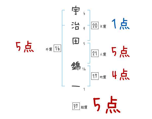 外運![]() | 宇治田錦一さんの外運は16画の5つ星!人望が厚く大きく発展する。逆転成功が見える。 生活面を象徴する運勢です。外部から受ける影響力を表し、結婚運、家庭運や職場、環境への順応性を表します。 |