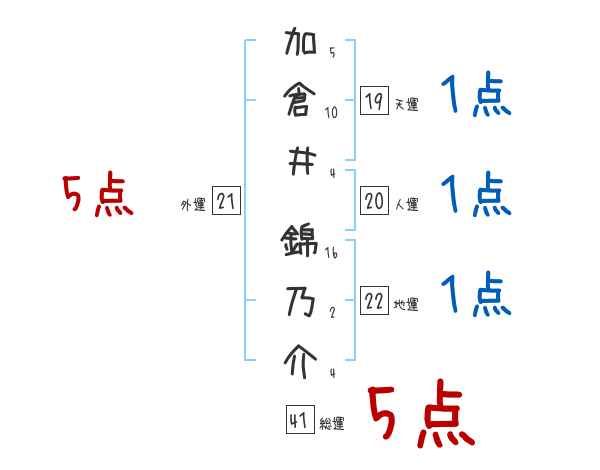 外運![]() | 加倉井錦乃介さんの外運は21画の5つ星!統率力がある。独立し成功する。名誉を手に入れる。 生活面を象徴する運勢です。外部から受ける影響力を表し、結婚運、家庭運や職場、環境への順応性を表します。 |