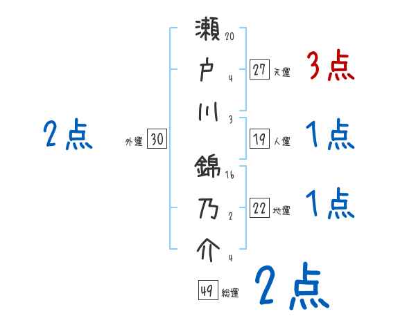 天運![]() | 瀬戸川錦乃介さんの天運は27画の3つ星!頭脳明晰だが強情で摩擦が多い傾向。孤立に注意。 家系が持つ宿命的な運勢を表します。祖先から受け継いだ苗字ですので自分の力が及びません。家柄を象徴します。 |