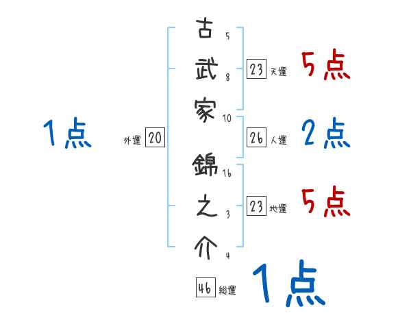天運![]() | 古武家錦之介さんの天運は23画の5つ星!想像力に優れ活力がある。一代で成功し名誉を手に入れる。 家系が持つ宿命的な運勢を表します。祖先から受け継いだ苗字ですので自分の力が及びません。家柄を象徴します。 |