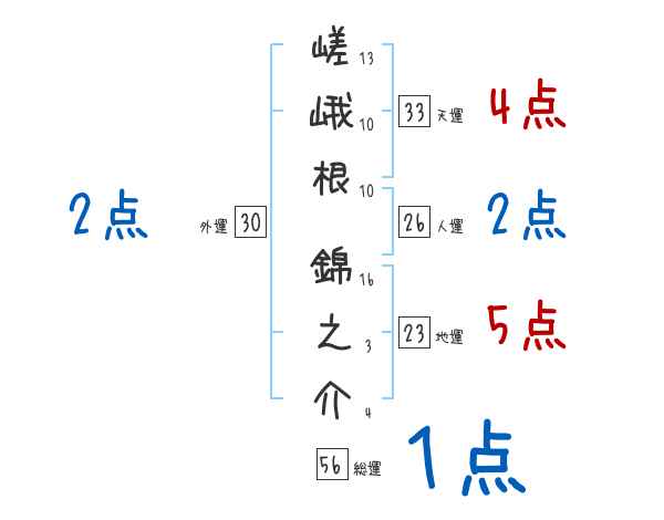 嵯峨根錦之介さんの画数の鑑定結果