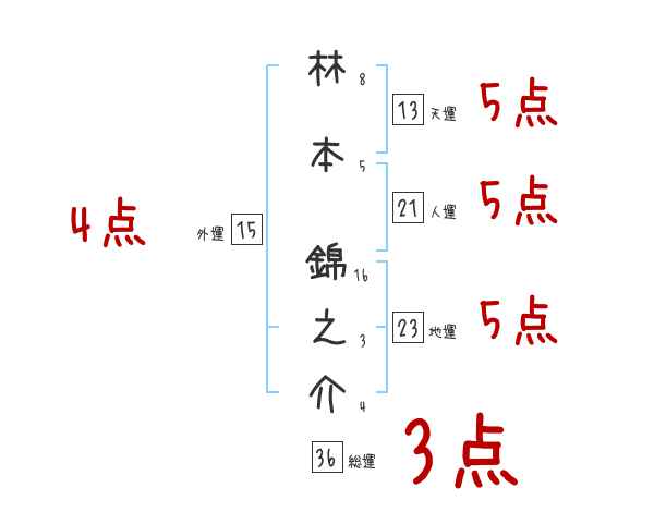 総運![]() | 林本錦之介さんの総運は36画の3つ星!先見性が豊かです。多少神経質で苦労することも。 あなたの人生を表す1番重要な運勢です。生涯を通じて影響する総合運となり、主に50歳以降の晩年期に影響を及ぼします。 |