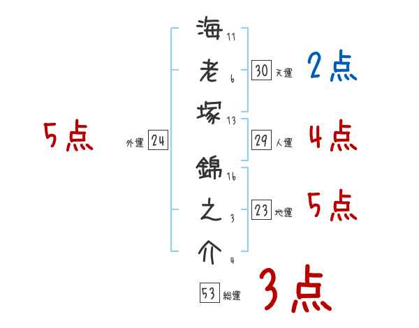総運![]() | 海老塚錦之介さんの総運は53画の3つ星!やや見栄っ張りで虚栄心がある。散財に注意。 あなたの人生を表す1番重要な運勢です。生涯を通じて影響する総合運となり、主に50歳以降の晩年期に影響を及ぼします。 |
