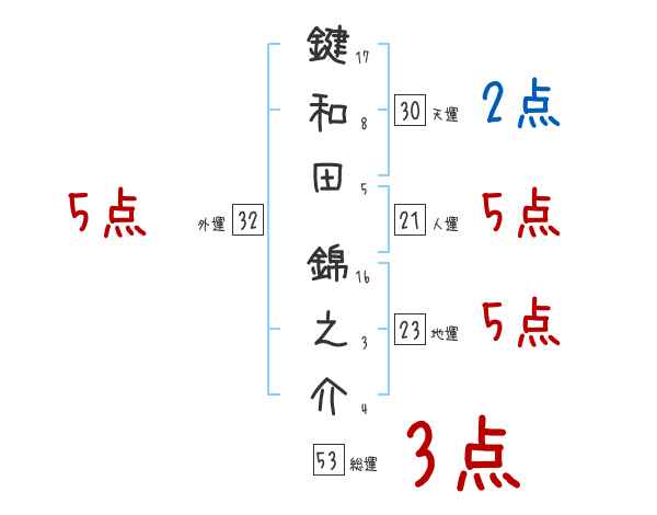 外運![]() | 鍵和田錦之介さんの外運は32画の5つ星!柔軟性があり成功する。チャンスが多く金運が良い。 生活面を象徴する運勢です。外部から受ける影響力を表し、結婚運、家庭運や職場、環境への順応性を表します。 |