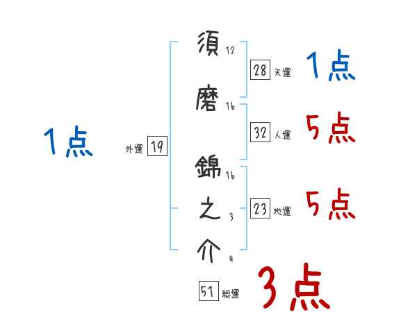 天運![]() | 須磨錦之介さんの天運は28画の1つ星!家庭環境に注意。スポーツで活躍できる能力があるかも。 家系が持つ宿命的な運勢を表します。祖先から受け継いだ苗字ですので自分の力が及びません。家柄を象徴します。 |