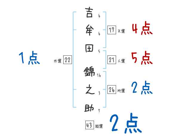 外運![]() | 吉牟田錦之助さんの外運は22画の1つ星!努力することが苦手ないっぽう手先が器用。芸術性にも優れる。 生活面を象徴する運勢です。外部から受ける影響力を表し、結婚運、家庭運や職場、環境への順応性を表します。 |