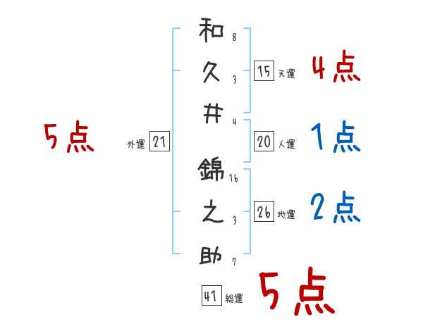 総運![]() | 和久井錦之助さんの総運は41画の5つ星!大志を抱き、目標に向かって実力を発揮し達成する。温和な性格。 あなたの人生を表す1番重要な運勢です。生涯を通じて影響する総合運となり、主に50歳以降の晩年期に影響を及ぼします。 |
