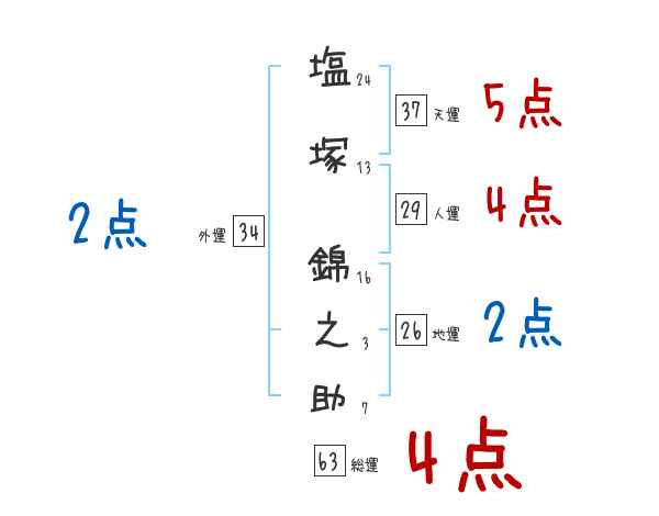 天運![]() | 塩塚錦之助さんの天運は37画の5つ星!努力家で順応性に優れる。現実的な考え方ができ忠実に物事をこなす。 家系が持つ宿命的な運勢を表します。祖先から受け継いだ苗字ですので自分の力が及びません。家柄を象徴します。 |