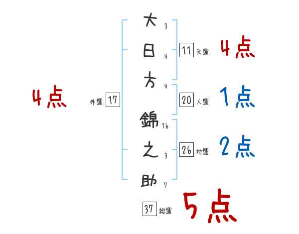 総運![]() | 大日方錦之助さんの総運は37画の5つ星!努力家で順応性に優れる。現実的な考え方ができ忠実に物事をこなす。 あなたの人生を表す1番重要な運勢です。生涯を通じて影響する総合運となり、主に50歳以降の晩年期に影響を及ぼします。 |
