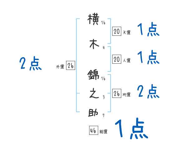外運![]() | 横木錦之助さんの外運は26画の2つ星!波瀾万丈かも。信頼できる人を大事にしましょう。 生活面を象徴する運勢です。外部から受ける影響力を表し、結婚運、家庭運や職場、環境への順応性を表します。 |