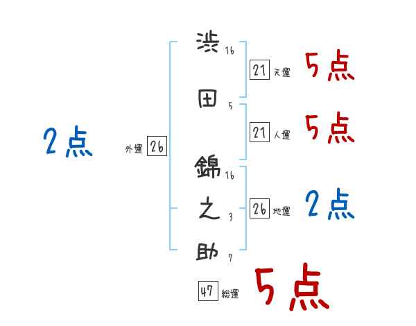 天運![]() | 渋田錦之助さんの天運は21画の5つ星!統率力がある。独立し成功する。名誉を手に入れる。 家系が持つ宿命的な運勢を表します。祖先から受け継いだ苗字ですので自分の力が及びません。家柄を象徴します。 |